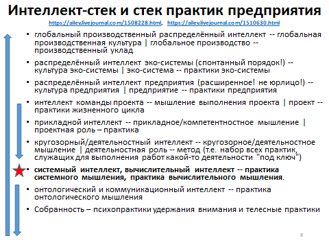 Данные уровни мастерства для человека соотносятся с интеллект-стеком: мастерство собранности формируется за счет практик собранности из интеллект-стека; методологическое мастерство - за счет практик онтологического и системного мышления, вычислительного мышления, кругозорных/деятельностных практик; прикладное мастерство - за счет постановки и опыта применения прикладных практик.