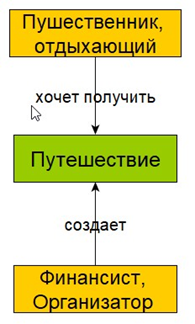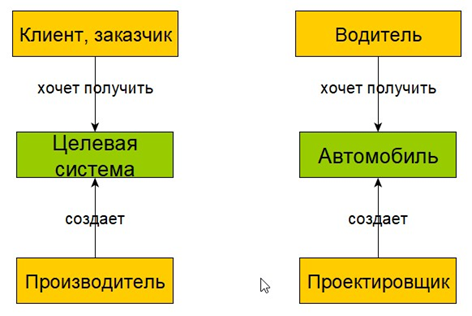 Рассмотрим пример с автомобилем. Водитель как клиент хочет автомобиль. Автомобиль – это продукт или целевая система для производителя. Машину изготавливает целая команда - от проектировщиков до рабочих конвейера. Сложную реальность физического мира мы разделили своим вниманием на три области интересов: клиентская или предпринимательская, продуктовая или инженерная, обеспечивающая область предприятия или менеджерская. Такое разделение позволяет отдельно рассмотреть желания или потребности водителя. Водитель хочет перевозить грузы, ездить на рыбалку или машина ему нужна для статуса. Причем кроме водителя есть и другие проектные роли в предпринимательской (клиентской) области интересов. Например, пассажир, конкуренты и т.п. Для кого мы делаем машину решает предприниматель, который сам находится в области предприятия, но его интересует клиентская область. Во-вторых, мы можем обсудить требования к автомобилю со стороны этих многочисленных ролей, а также саму машину. Этим занимается инженер, который сам находится в области предприятия, но его интересует область продукта. В-третьих, мы можем обсудить деятельность всех проектных ролей, которые создают транспортное средство. Кроме уже упомянутых предпринимателя и инженера, в этой области интересов есть менеджер, маркетологи, бухгалтера и т.п. Иван как выученный проектировщик также относится в области предприятия.