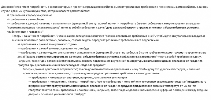 В первом посте я описал первый подход к вопросу "зачем наша система". Вышло, что наша система это "дача", а потребность домохозяйства, в состав имущества которого может входить дача - это загородный отдых на свежем воздухе. Дальше надо было повозиться и выделить еще потребности домохозяйства-надсистемы - а потом исходя из них сформулировать требования к нашей даче. На самом деле это непростая работа, и для этого есть целые практики, и целые специально обученные люди занимаются этим целыми днями, чтобы получить хороший результат.