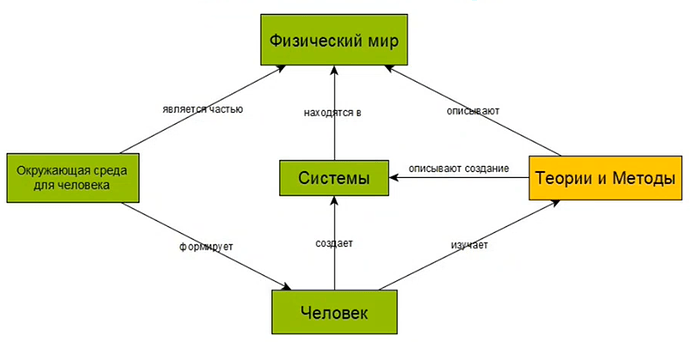 Человек изучает теории и методы. Создает различные сложные системы - машины, самолеты, роботов, которые находятся в физическом мире. Окружающая среда также влияет на человека. В Системном Мышлении мы изучаем теории, практики, методы, дисциплины чтобы привносить новые системы в физический мир для того чтобы его изменить. Системное Мышление позволяет из разных картин мира собирать систему, которая будет удовлетворять потребностям разных проектных ролей.
