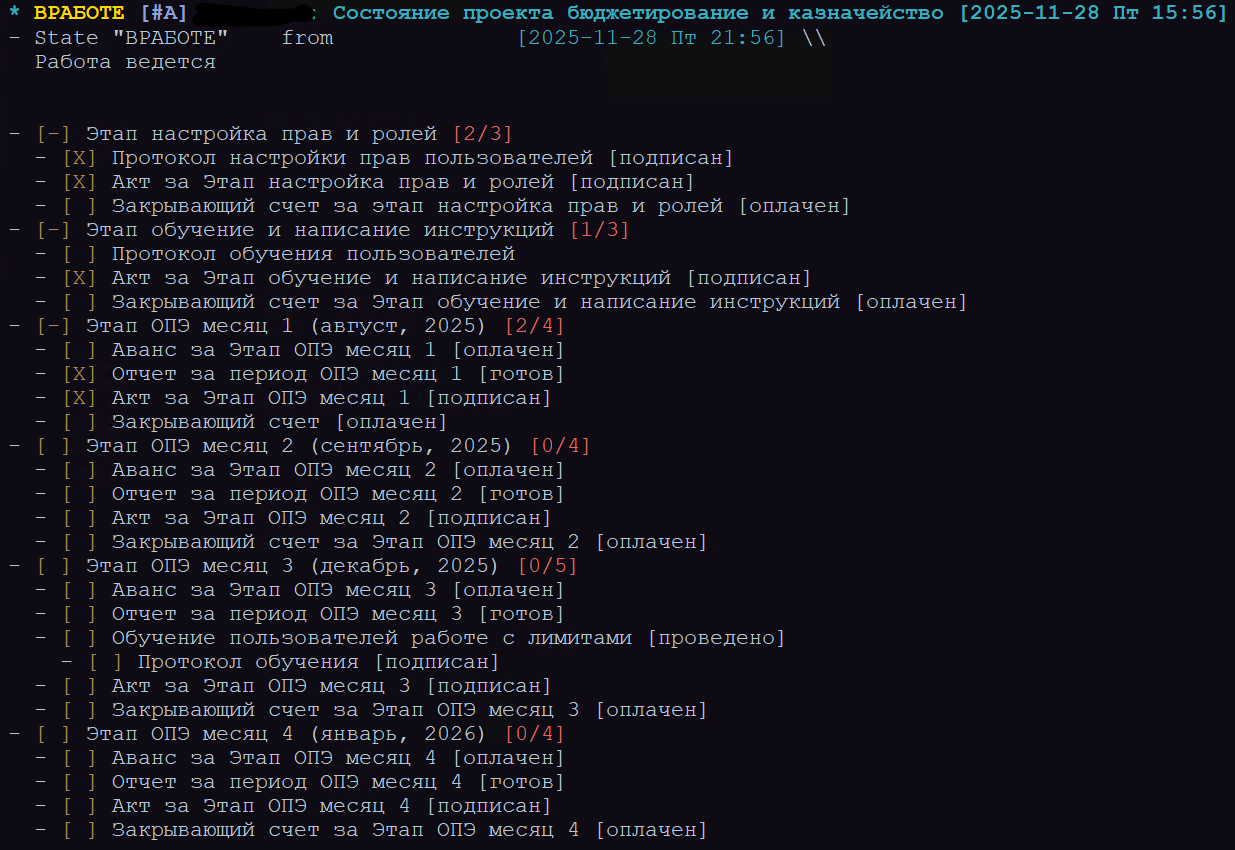 В нем для каждого этапа обозначен рабочий продукт за которым надо следить и не пропустить, и в конце строки выделено требуемое состояние, за которым так же надо следить. И это вышло из под пальцев как само собой разумеющееся. Как будто так и должно быть.