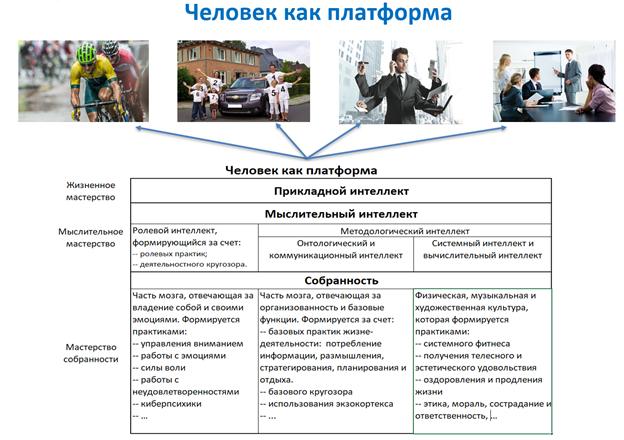 Идея человеческой платформы состоит в том, чтобы развить части мозга и тела до такого уровня, которое позволит в дальнейшем легко и быстро дообучаться до нужного уровня жизненного мастерства. В жизни человек часто переучивается и играет многочисленные роли, вписывается в рабочие и социальные коллективы, ему приходится соответствовать разным требованиям. Понятие человеческой платформы позволяет говорить об универсальном мастерстве человека, которому по жизни придется быть мужем, отцом, воспитателем, менеджером-инженером-предпринимателем хотя бы по отношению к своей жизни, а также исполнять роли в рабочем проекте (инженер по требованию, маркетолог, ИТ-разработчик и т.п.) или в различных жизненных ситуациях. Человек как платформа должен быть способен выполнять различные практики на всех стадиях жизнедеятельности бесконечно-развивающегося человека.