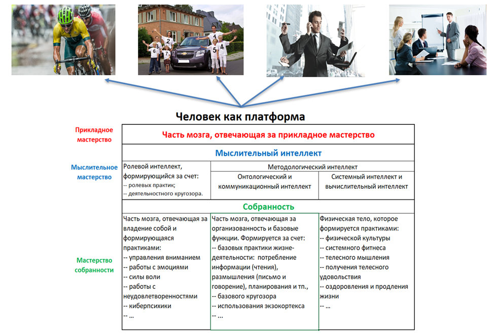 Ролевое мастерство неспроста является частью мыслительного мастерства, оно совместно с методологическим мастерством помогает осваивать и играть разные проектные роли. Ролевое мастерство – это проявление интеллекта. Интеллект задействуется в выборе подходящей роли так, чтобы учесть множество разных интересов. Человек попадает в разные ситуации, в которых от него требуются определенные действия. В большинстве случаев интеллект не задействуется, а действия совершаются исходя из рефлексов, опыта или интуитивно[6]. Но в некоторых случаях человек осознанно определяет нужные роли, и вот за это отвечает интеллект или его функциональная часть – ролевое мастерство.