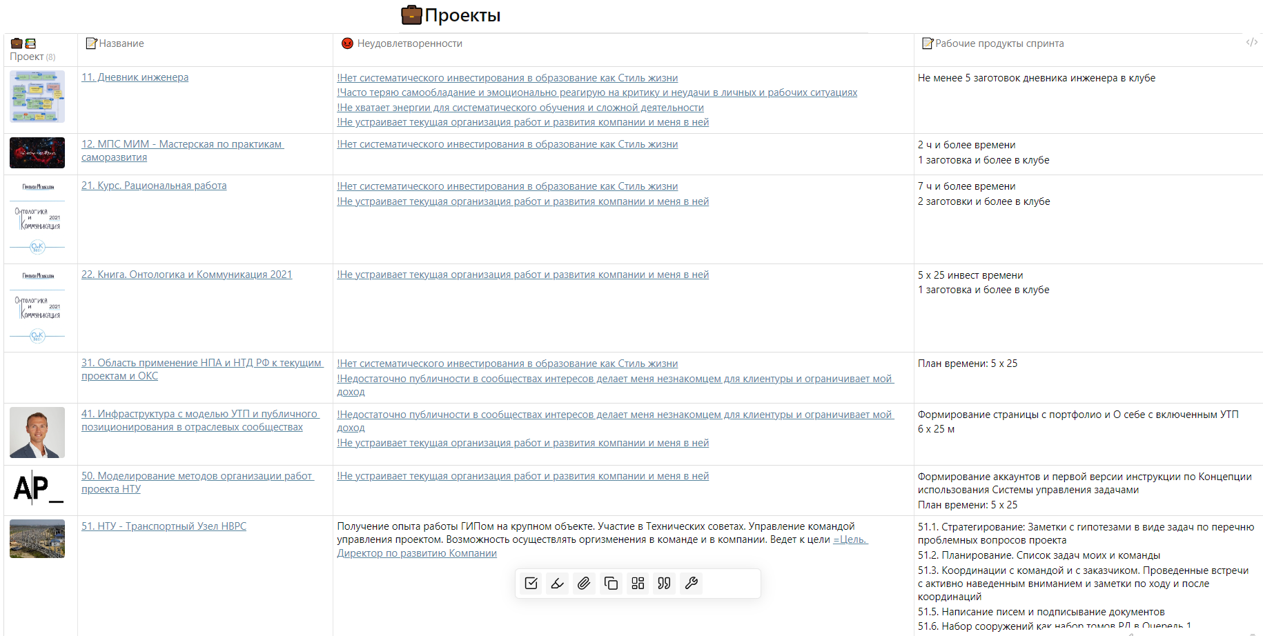 - Можно разметить тегами неудовлетворённости в рабочем проекте, сформировать стратегию по аналогии в личном. И вести дневник инженера публично по рабочему проекту на личном сайте или телеграмм канале и в соцсетях в рамках проекта [[41. Инфраструктура с моделью УТП и публичного позиционирования в отраслевых сообществах]]