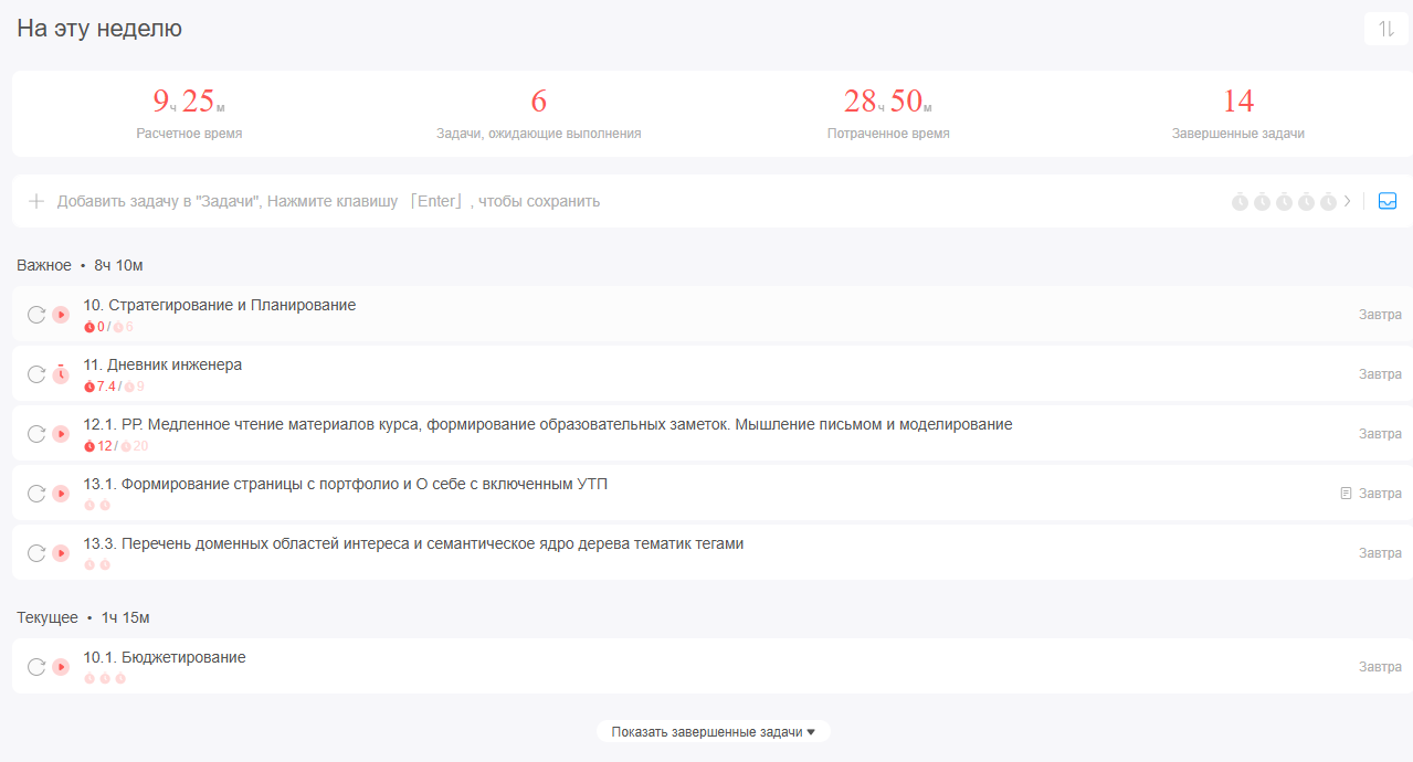 - интеллектуал Получается проходить (пусть и в своем темпе) с пользой курс [[12.1. Курс. Рациональная работа]]. Время учитывается, заготовки публикуются. Это прикольно!