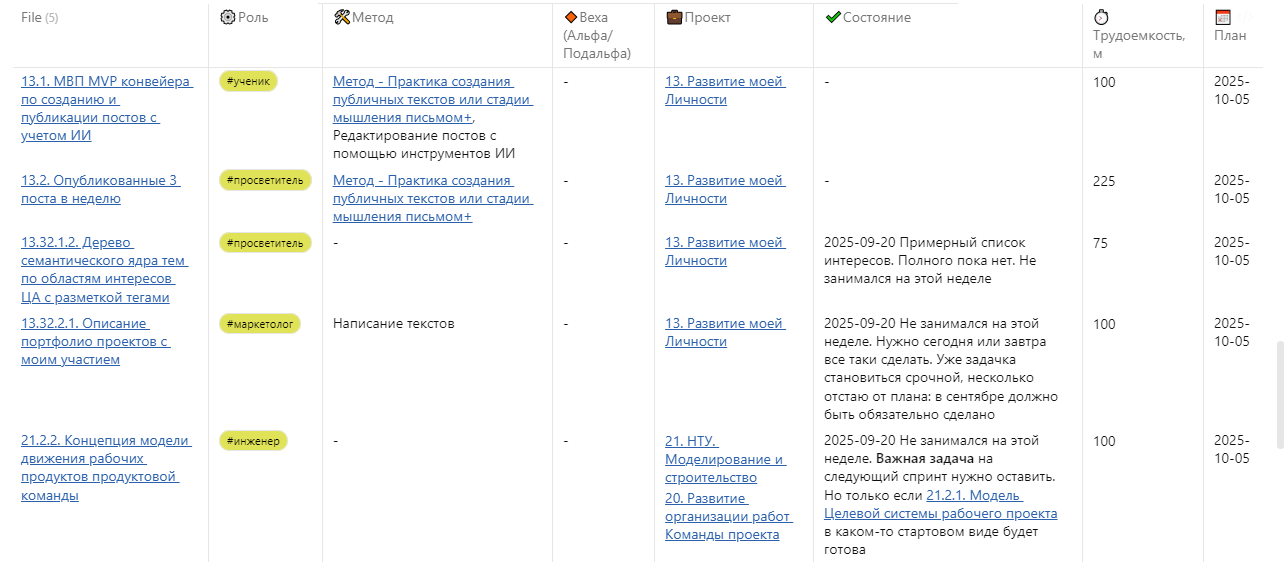 - пришла наконец в голову идея как все таки настроить производственный конвейер по работе команды проекта, а также как все таки увязать инструменты экзокортекса в единую систему для возможности пользоваться в бесшовном или “менее шовном” режиме