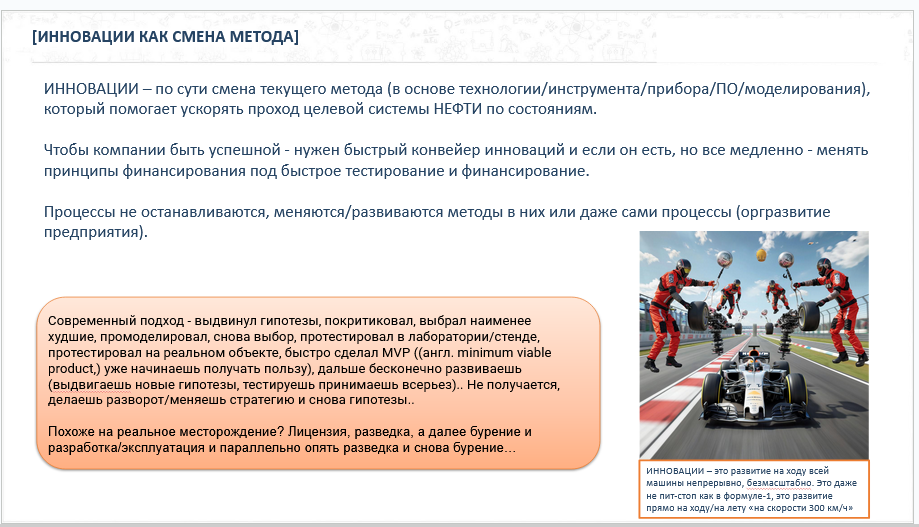 Тут обращаю внимание на картинку - команда Ф-1 прямо на лету что-то меняет в машине. ИННОВАЦИИ – это развитие на ходу всей машины непрерывно, безмасштабно. Это даже не пит-стоп как в формуле-1, это развитие прямо на ходу/на лету «на скорости 300 км/ч»