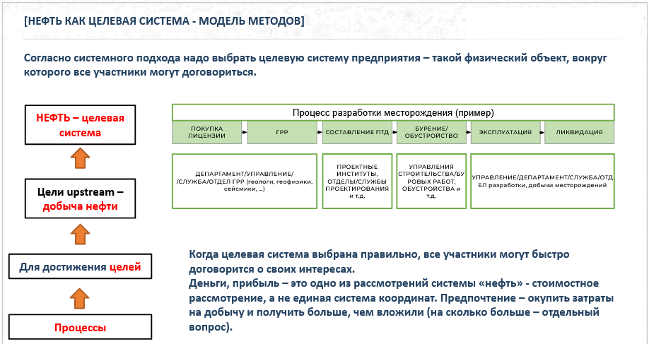 Здесь говорю, что процессы нужны для достижения целей, а цель Upstream - добыча нефти. Нефть - целевая система. (тут конечно упрощенно, и всю цепочку рассуждений я не буду приводить, но пока это не так важно). Тут могут быть споры и могут говрить, что важнее всего прибыль и повышение стоимости компании. Специально привел аргументы почему не деньги в данной модели важны, а именно физический объект, продукция компании и только части компании, которая занимается выпуском продукции - нефть.