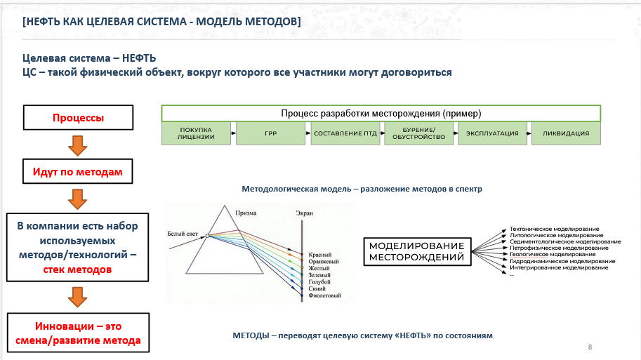 Здесь подвожу всех к модели методов и почему методы важнее выделить при рассмотрении с точки зрения команды инновационных проектов и инновационного развития, чем просто процессы.И немного поясняю что значит разложить метод в спектр.