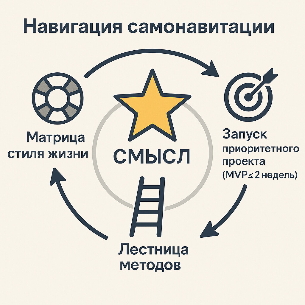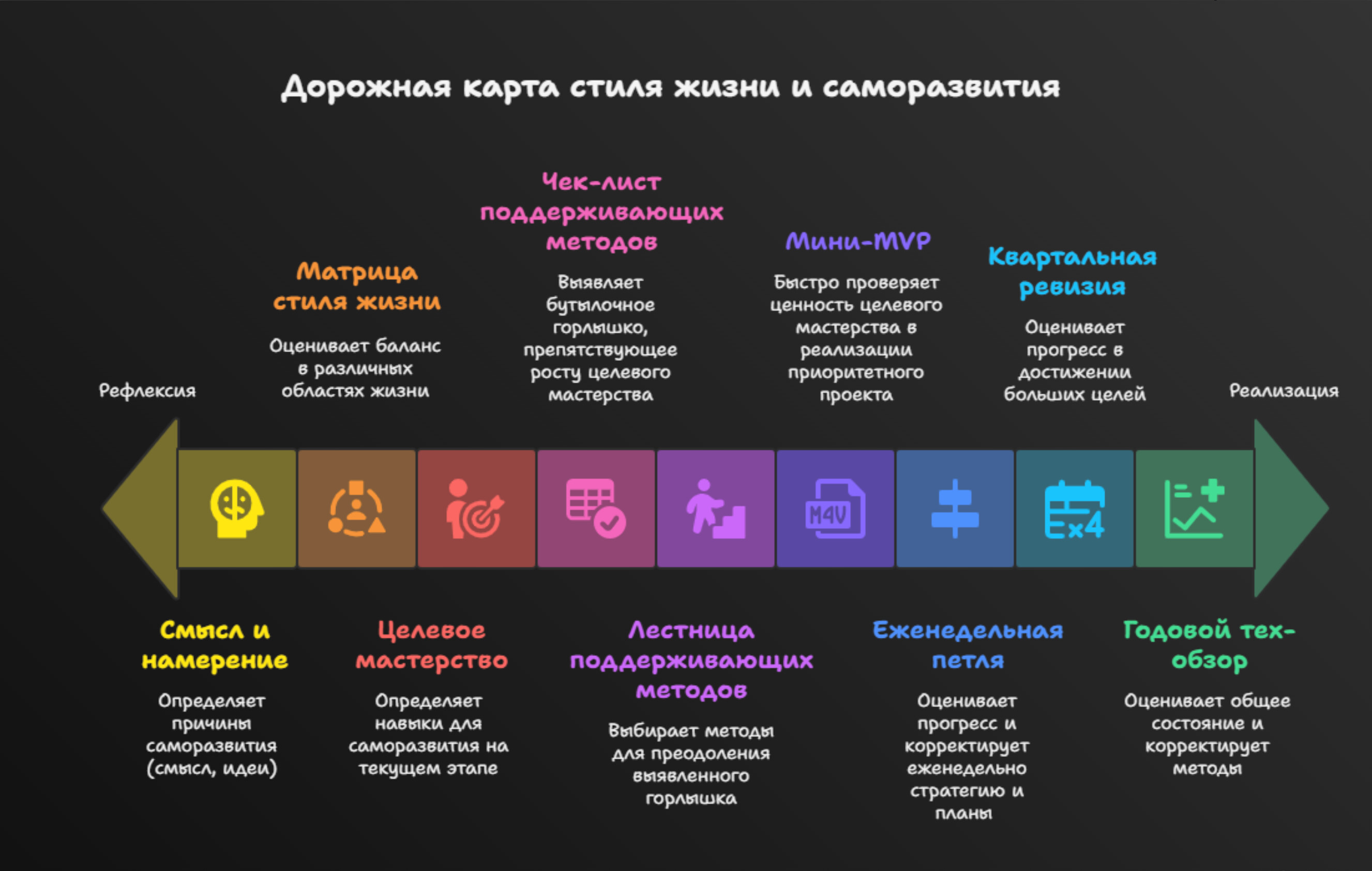 Таким образом цепочка “Смысл → Матрица → Мастерство → Чек-лист → Лестница → Мини-MVP → Петля ревизии” позволяет каждую неделю укреплять слабое звено, каждые три месяца сверяться с крупными целями, а каждый год подтверждать, что организм и личность готовы к следующему уровню мастерства.