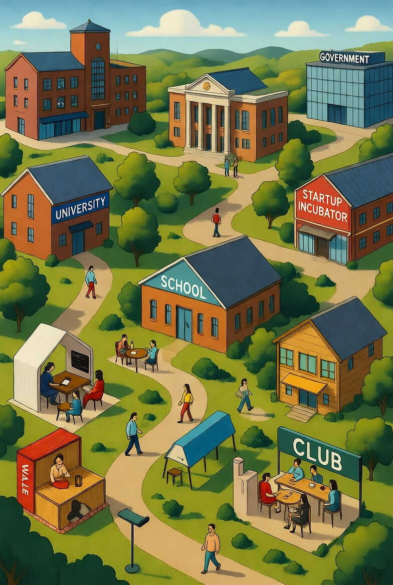 Что внутри экосистемы? Школы, мастерские, клуб и сообщество инженеров‑менеджеров, а также многие другие институты и даже стартапы. Все это пространство с культурой непрерывного и бесконечного развития, где распространено системное мировоззрение.