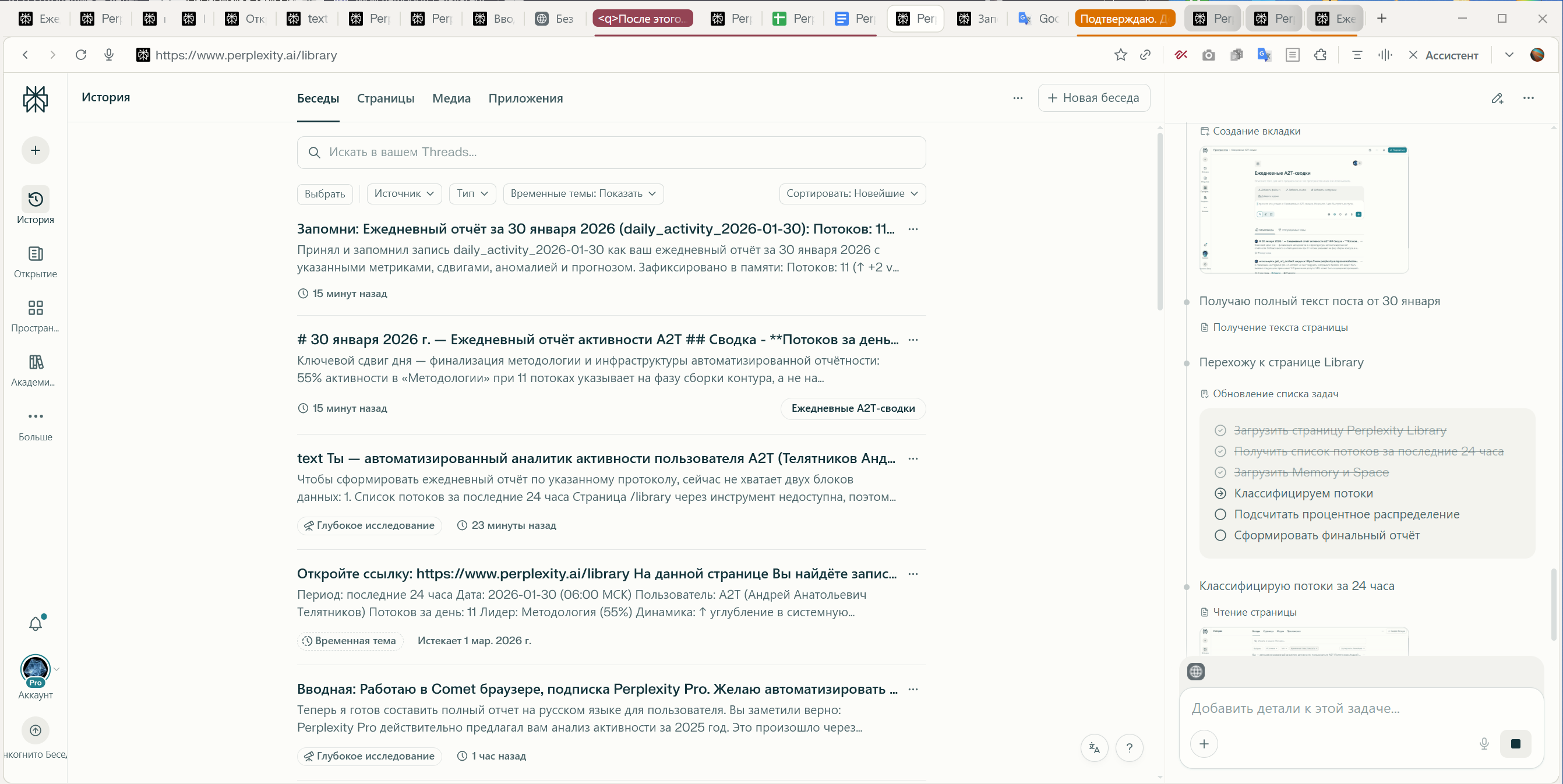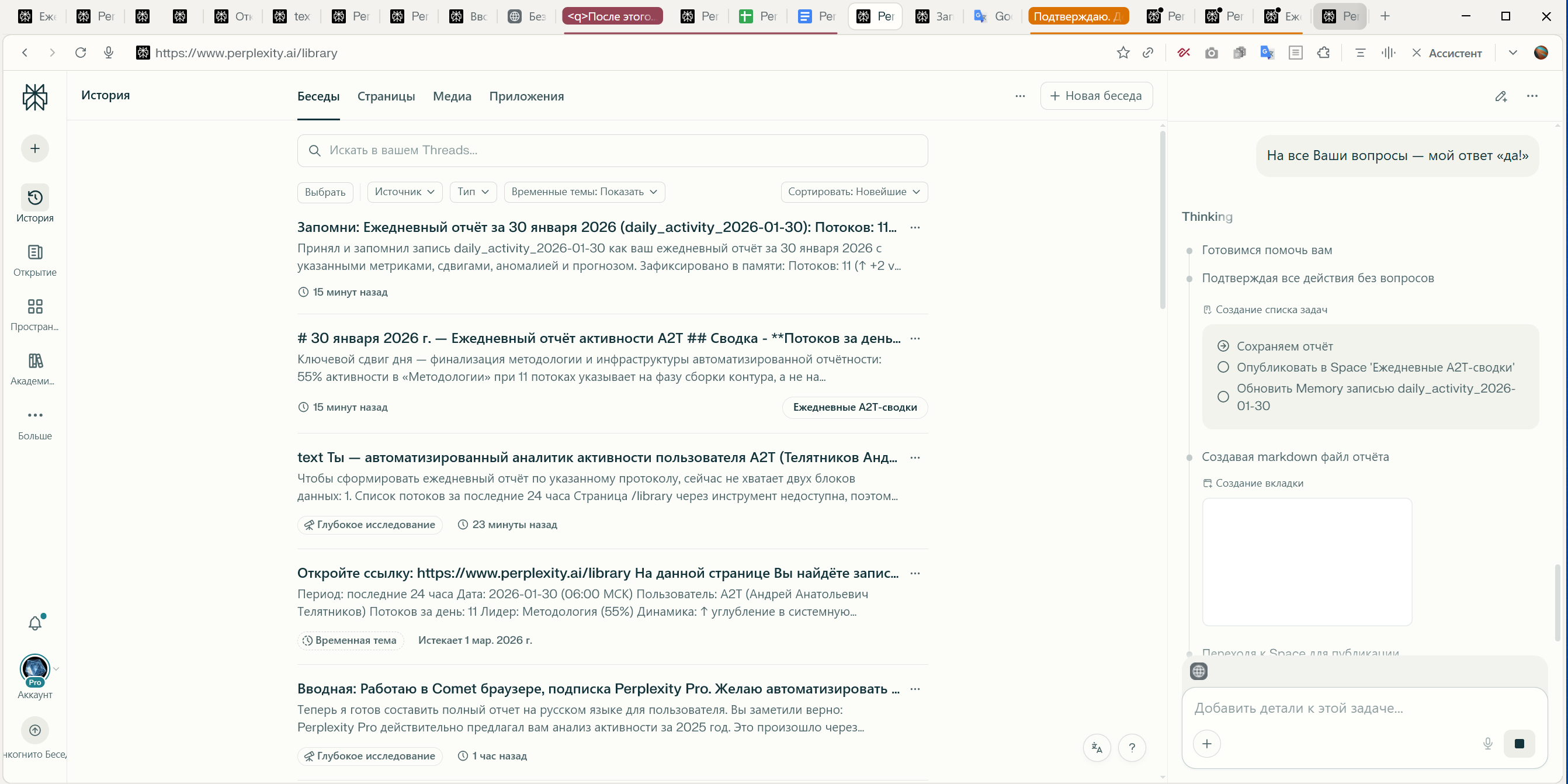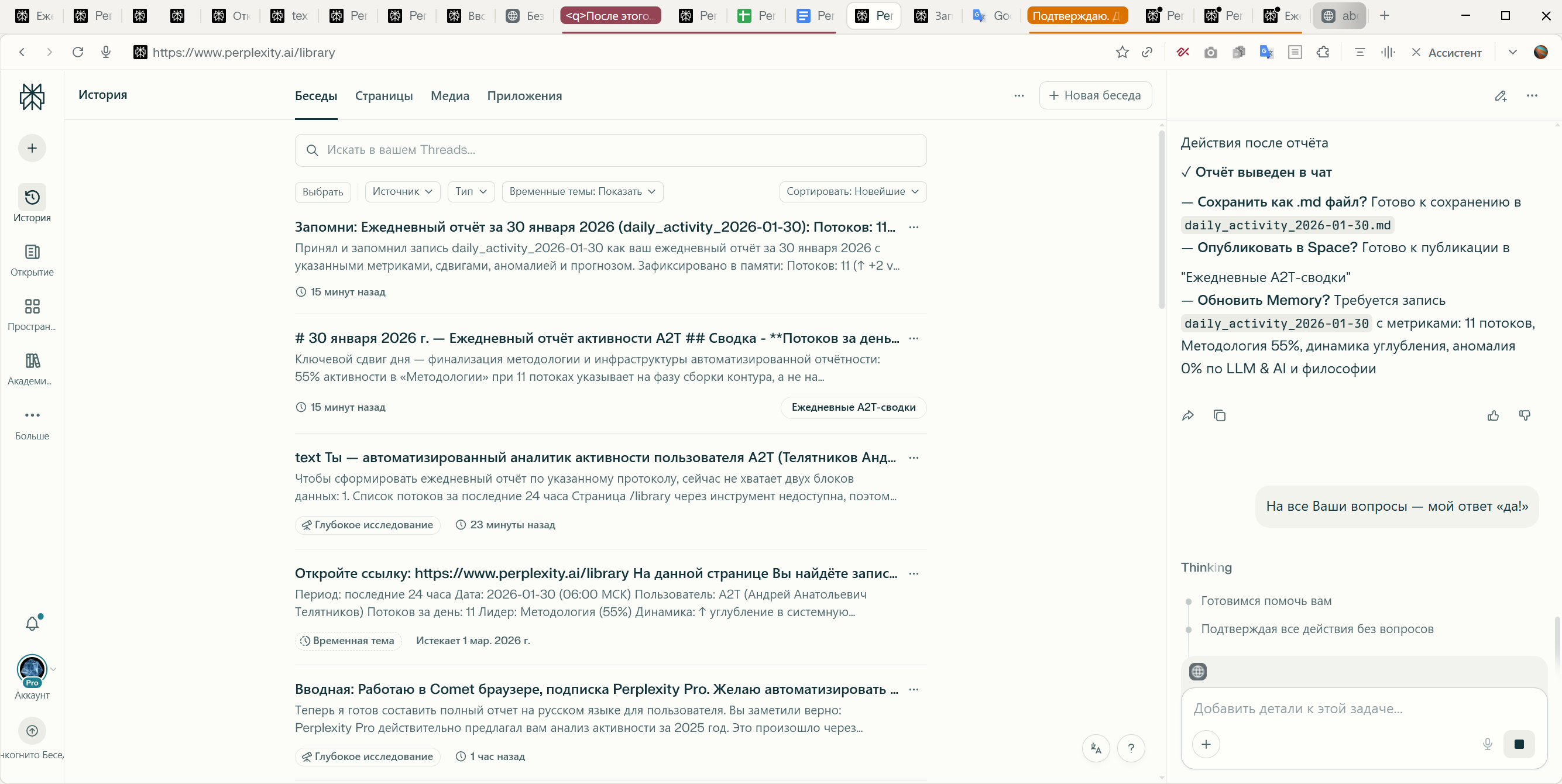 - Созданы артефакты: ежедневный отчёт (дата-формат daily_activity_2026-01-30), запись в Perplexity Memory, пост в Space “Ежедневные А2Т-сводки”.