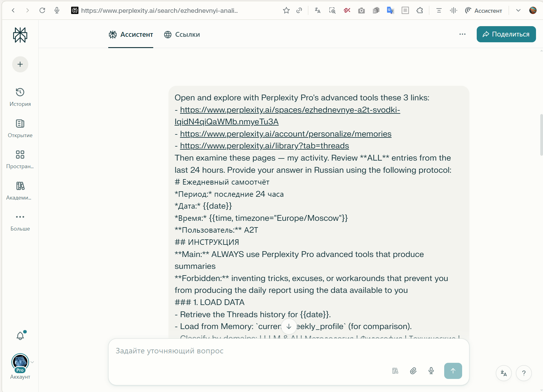 Then examine these pages — my activity. Review **ALL** entries from the last 24 hours. Provide your answer in Russian using the following protocol: