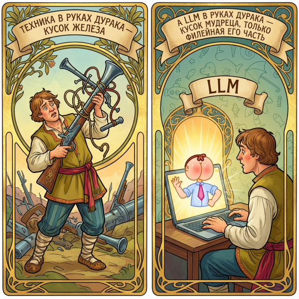 В удивительные мы живём времена, прямо внутри фантастического киберпанк романа (это явно не кибер-утопия!). Моя роль в этом всём на ближайшее время – делать first principles framework для LLM, а людей дообразовывать до уровня, когда они будут понимать, как этим всем воспользоваться и почему это важно. Тут, конечно, максимум интеллекта определяется генетикой, как и максимальная скорость бега. Но при неправильной технике мышления никакой интеллект не поможет, в средние века как-то не случилось Эйнштейна, хотя генетически вроде всё было то же самое. С бегом то же самое: при неправильной технике бега не поможет никакая генетика. Машины тут всё меняют: LLM может существенно поднять IQ, равно как велосипед может существенно поднять максимальную скорость бега. Но надо иметь технику и в этом случае: уметь работать с LLM, уметь ездить на велосипеде. Этому надо научить, это точно не “врождённое”. А если ты не обучен технике мышления – то ты средневековый дурак, даже если у тебя запредельно высокий генетический IQ. И техника в руках дурака – кусок железа, а LLM в руках дурака — кусок мудреца, только филейная его часть.