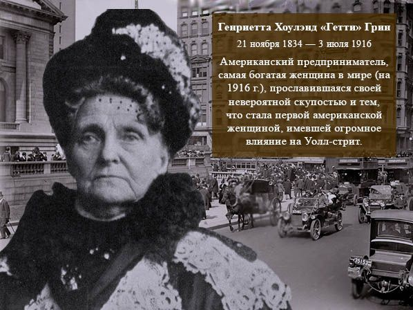 Деньги, конечно, являются хорошим индикатором успеха. Однако, это не единственный и даже не главный индикатор. Вряд ли можно назвать жизнь Генриетты "Гетти" Грин[6] известной по прозвищу "Ведьма с Уолл-стрит" интересной и счастливой. Став самой богатой женщиной в мире в 1916 году была ли она успешна и счастлива? Систему по зарабатыванию денег, которая не приносит удовлетворения другим людям, сложно назвать успешной. Хотя выдающейся или достойной восхищения такую систему и такую способность Грин назвать можно.