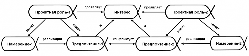 Разные роли имеют разные ролевые предпочтения в интересе. Если общий интерес проектных ролей покупателя и продавца — цена, то ролевое предпочтение покупателя в минимизации цены, а предпочтение продавца — в максимизации цены. Для реализации/воплощения своих предпочтений в интересе проектные роли имеют какие-то деятельностные намерения — и вот тут люди обычно очень изобретательны, и могут запустить совсем неочевидную цепочку действий даже при сугубо положительных предпочтениях (интерес: головная боль, предпочтение: голова не должна болеть, намерение: отрубить голову — нет головы, не будет головной боли). Ещё в намерение может входить задействование других ролей, которые могут выполнять какие-то совсем другие практики — и эти другие роли могут исполняться тем же актором/актёром/исполнителем/сотрудником, или какими-то совсем другими людьми (и им могут за это даже заплатить!). Это окончательно запутывает ситуацию, но понятий «исполнитель роли», «роль», «интерес», «предпочтение», «намерение» должно хватить для подробного разбирательства с самыми разными ситуациями, связанными с поведением людей в проектах.