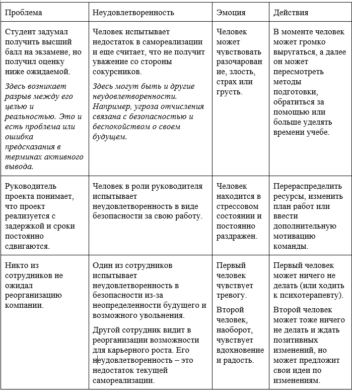 Любая неудовлетворенность стимулирует человеческую реакцию и может выражаться в виде какой-то – эмоции или чувства (3), которую будем рассматривать отдельно. Например, когда менеджер сталкивается с проблемой, например, снижением продаж, то у него как у человека будет какая-то психическая (эмоциональная) реакция. Так один человек на должности руководителя может почувствовать гнев из-за потери уважения, а другой — просто разочарование.