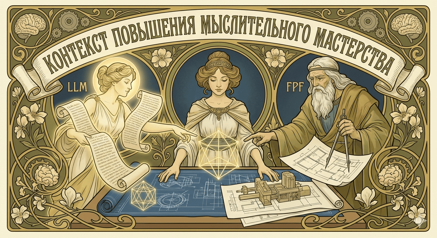 - Освоенный и загруженный в голову материал из руководств я использую при мышлении c LLM+FPF о конкретных реальных рабочих ситуациях, применяя таким образом его на практике. Это мышление может как касаться контекста реального проекта, так и нет (например, разъяснение того или иного паттерна FPF).
