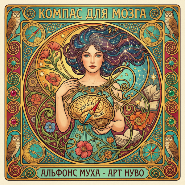 Традиционная картинка с промптом “компас для мозга” как ближайшая аллегория для “куда думать”, в этот раз исполнитель – Nano Banana Pro, первый же результат вот (полный промпт: “Нарисуй “компас для мозга”. Стиль художника Альфонса Мухи, яркие цвета”):