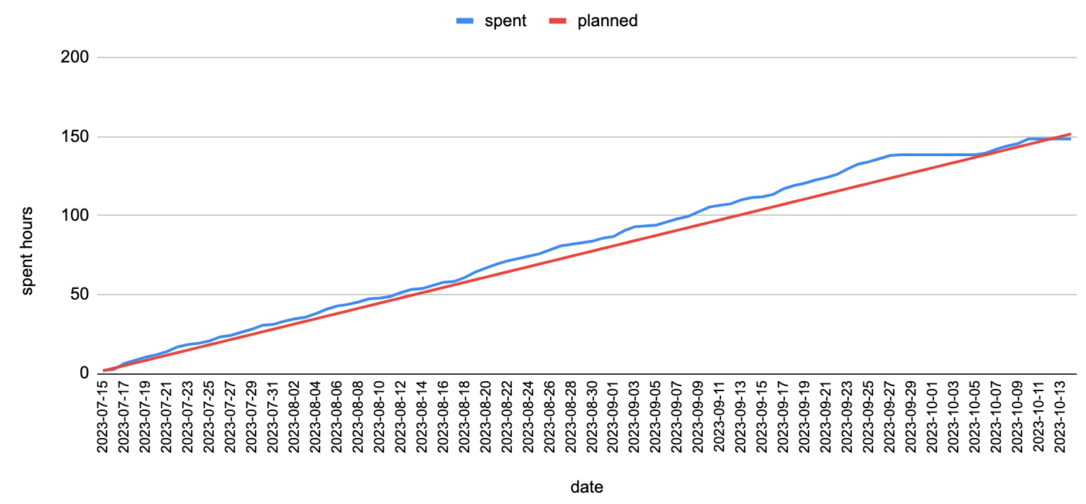 - Инвестировал 148.5 часов из 150 запланированных(более-менее равномерно шел, но в конце выпал почти на неделю)