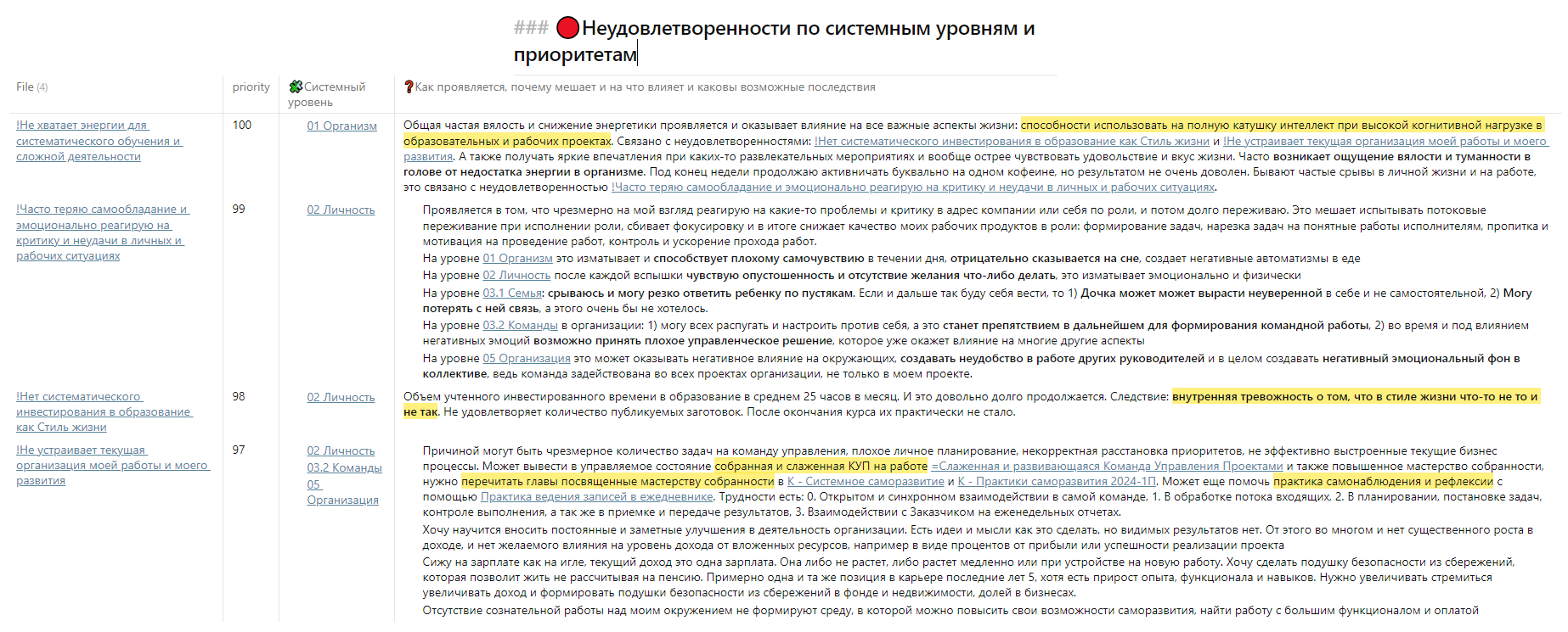 Пересмотрел свои неудовлетворенности по приоритетам. Все таки действительно при работе в саморазвитии важно идти по системным уровням снизу вверх. Так как это действительно стек предметов внимания личного развития. По аналогии с программой стеков школы системного мышления, все мастерства деятеля так же могут быть разбиты по уровням и наслаиваться одно на другое, где предыдущее мастерство является фундаментом к последующему. Сначала идут работы по методам по снятию ограничений и препятствий на уровне [[01 Организм]], потом на уровне [[02 Личность]], и далее это сделает проще поиск и снятие ограничений на уровне выше. Это не говорит о том, что нельзя делать работы на сисуровнях выше ([[03.2 Команды]], [[05 Организация]]), это относиться к эффективности в последовательности работ именно с ограничениями: сначала то что внизу, потом выше.