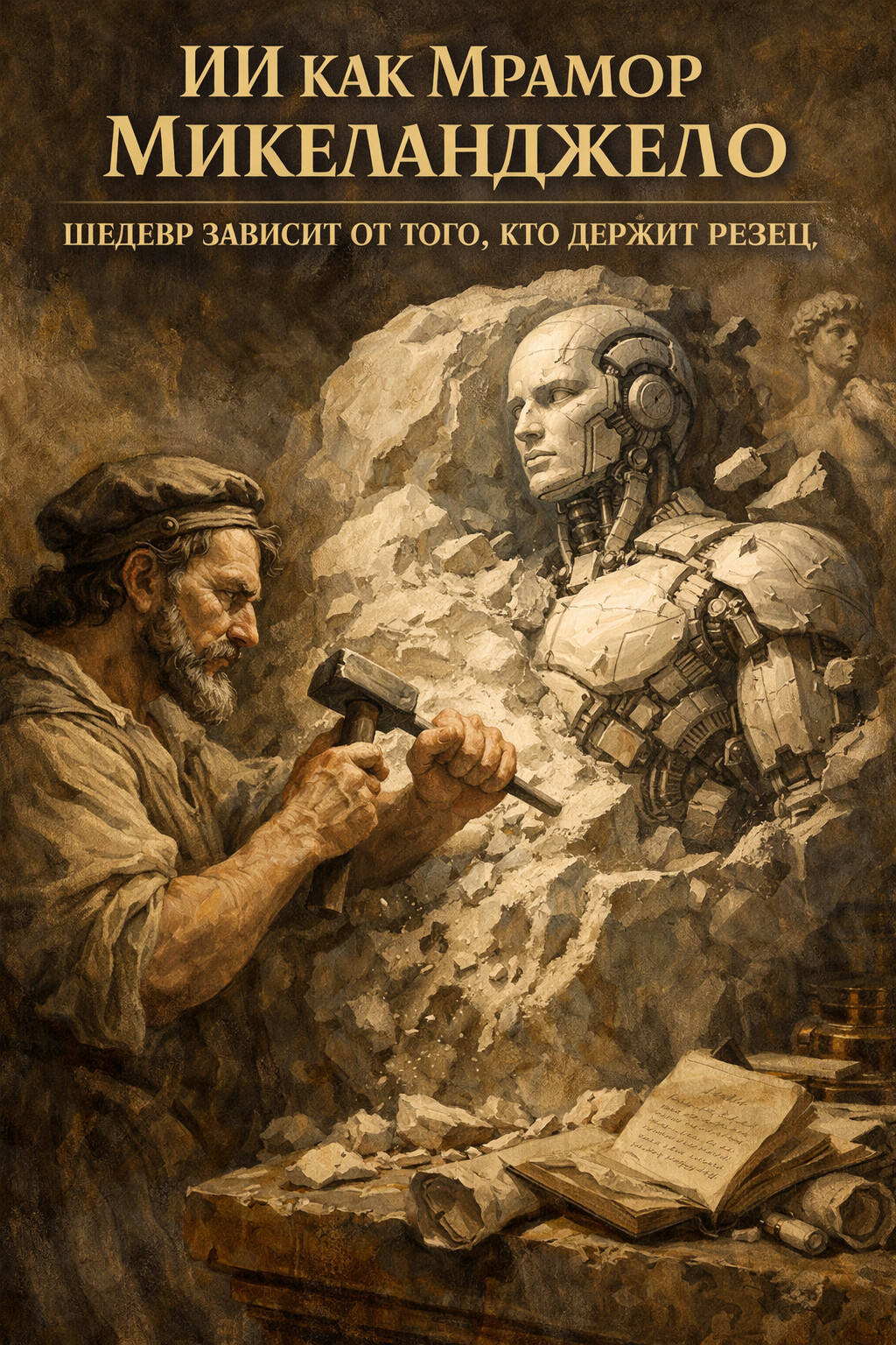 Полезная метафора — работа скульптора. Не потому, что ИИ «творит искусство», а потому что взаимодействие устроено похожим образом: перед вами огромная глыба слов, идей и вариантов, и результат зависит от того, кто держит резец. Как в знаменитой фразе Микеланджело: «я беру глыбу мрамора и отсекаю всё лишнее» (итал.: Io prendo un blocco di marmo e taglio via tutto ciò che è superfluo).