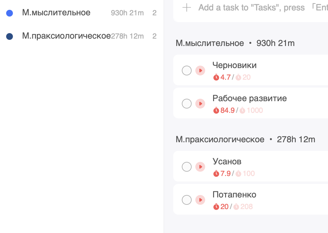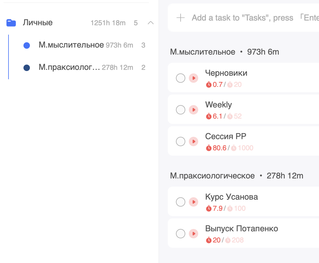 Айрат пишет: “После прочтения The Book of TameFlow абсолютно понятно, как работать в режиме мультитаскинга - не надо работать в этом режиме. Просто видно, что переключения вредны; вред идёт и от того, что на смену контекста нужно время, что больше работ возвращается”. С начала года я значительно удавил свой мультитаскинг - начинал с 12 задач на год в трекере, сейчас всего пять (апдейт на 8.02 - уже четыре). Если считать работу с черновиками частью рабочего развития, то фактически я переключаюсь между задачами по рабочему развитию, Усановым, Потапенко и личным стратегированием (и там где-то дремлет “культурная карта” и разбор заметок по английскому). Можно ли тут дальше “удавить мультитаскинг”? Внутри рабочего развития он же есть.