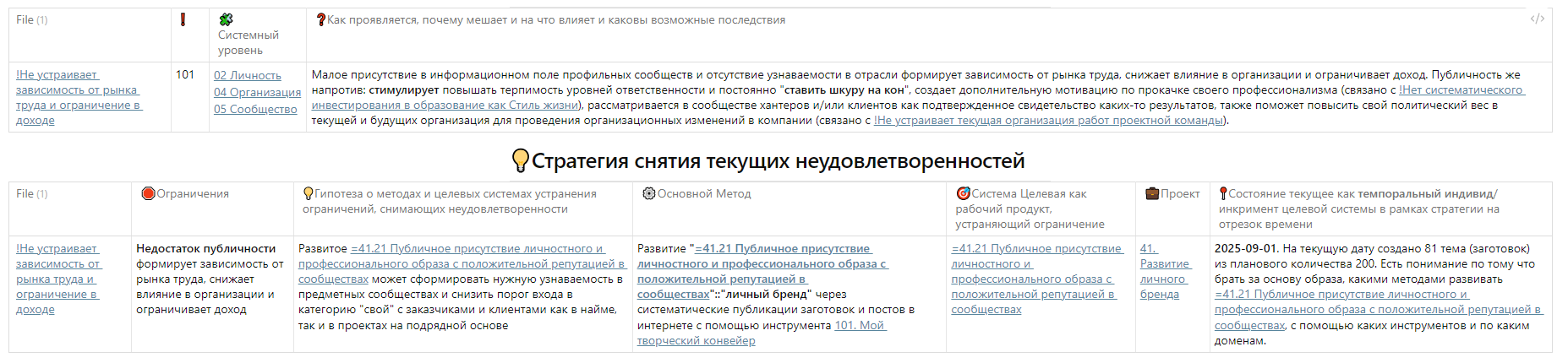 Малое присутствие в информационном профильном поле меня в роли, нет сформированной какой-то узнаваемости в отрасли, нет профессионального бренда. Поэтому при каждом выходе на рынок труда, кажется, что таких как ты сотни и тысячи. Это текущий доход это одна зарплата. Она либо не растет, либо растет медленно или при устройстве на новую работу. Нет подушки финансовой безопасности из сбережений, которая позволит 1. Прожить 6 месяцев всей семьей, сохраняя текущий образ жизни, 2. Создавать накопления для возможности в будущем жить не завися от пенсии государства. Скорость прироста моего дохода зависит от много чего конечно же. Одна из ключевых проблем это отсутствие активного наведения и удержания внимания на альфу Клиентура моих услуг: тут не важно как клиентов результатов моего сервиса/труда в найме и/или при работах по договорам подрядов при выполнении проектирования на заказ в свободное время. Как результат меня маловато в профильных публичных пространствах. Другими словами: [[!Не устраивает зависимость от рынка труда и ограничение в доходе]]