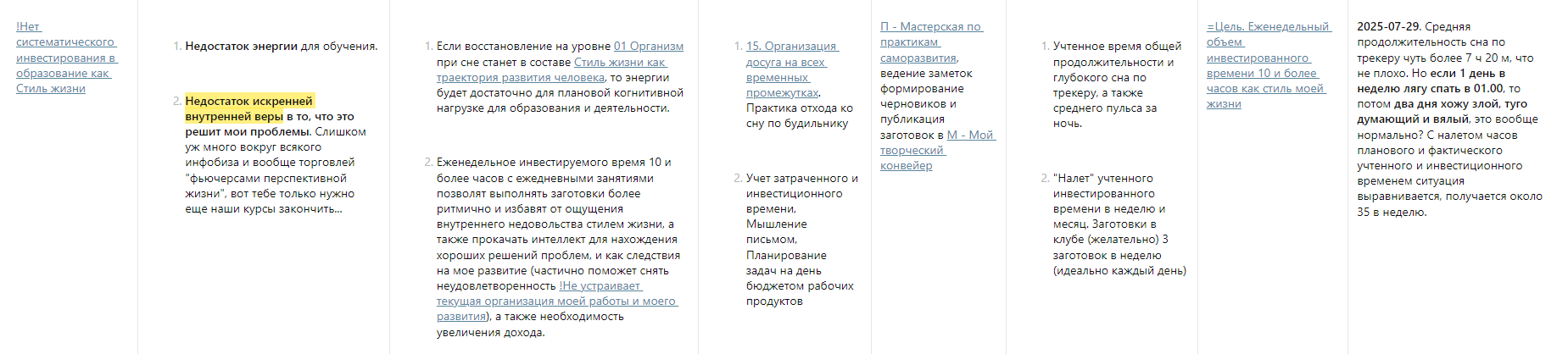 state:: 2025-07-29. Средняя продолжительность сна по трекеру чуть более 7 ч 20 м, что не плохо. Но если 1 день в неделю лягу спать в 01.00, то потом два дня хожу злой, туго думающий и вялый, это вообще нормально? С налетом часов планового и фактического учтенного и инвестиционного временем ситуация выравнивается, получается около 35 в неделю.