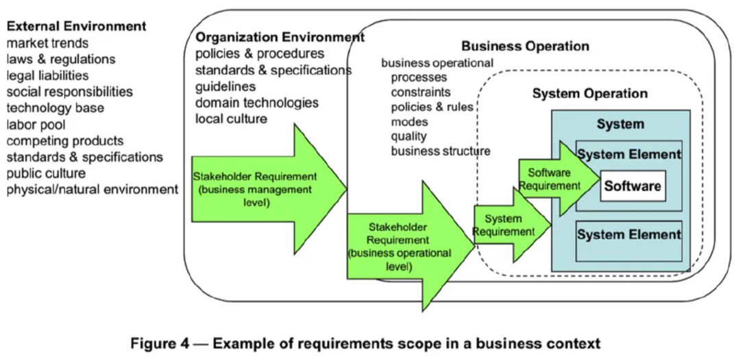 Целевой системой тут является system, требования к ней так и называются - system requirements. Требования к надсистеме (system operation) будут называться stakeholder requirement или потребности/нужды стейкхолдеров. Их не перепутать: они описывают разные системы на их границах (как “чёрный ящик”, без подробностей про внутреннее устройство каждой из систем), на картинке это чётко видно. При перемещении на уровень вверх “потребности” становятся требованиями, и появляются новые “потребности” для новой надсистемы. При перемещении на уровень вниз “требования” становятся “потребностями”, и появляются новые требования для новой “подсистемы”. Эти термины определяются относительно двух смежных системных уровней. Мы привели эту картинку для того, чтобы показать присутствие в проекте множества самых разных требований и потребностей. Нельзя считать, что в проекте есть только требования для целевой системы и потребности для надсистемы. Они, конечно, основные для рассмотрения, но обычно ситуация сложней, и выявлять приходится множество самых разных требований к самым разным учитываемым в проекте системам из системного разбиения целевой системы, её окружения, её систем в цепочке создания. Слишком много разных требований, легко запутаться? Документируйте, записывайте их - и вы не запутаетесь. Вы не гроссмейстер, в шахматы по памяти не сможете играть. В системном мышлении то же самое: “системное мышление по памяти” это просто цирковой трюк, так оно не работает, в том числе так не работает мышление о требованиях. Обязательно документируйте требования! Не надейтесь на память (что вы вспомните какое-то требование, когда будет нужно) и телепатию (что кто-то из вашей команды или внешних проектных ролей узнает о требовании каким-то способом, если это требование не было записано). Пишите!