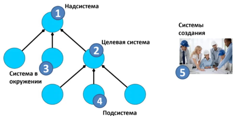 - виды систем: целевая, наша, подсистема, надсистема, окружение (системы в окружении), создатели (системы создания);