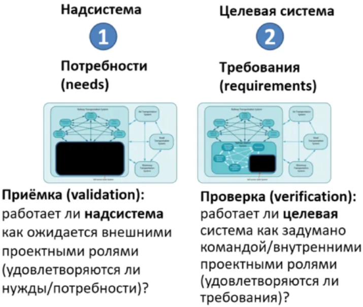 Почему же используются два слова? Потому что в каждом проекте обязательно проверяется работоспособность двух систем, проводятся два набора испытаний: проверочные (соответствие целевой системы требованиям) и приёмочные (соответствие надсистемы/использующей системы потребностям). Проверка и приёмка понимаются только при наличии системного мышления - это же разговор про работу на двух разных системных уровнях: целевой системы и надсистемы!