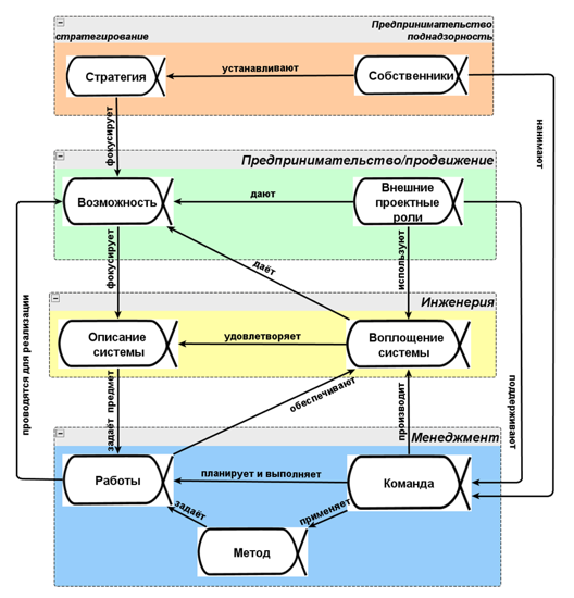 На системной схеме проекта[1] область интересов менеджера – это команда, работы и метод, которые обеспечивают воплощение системы.