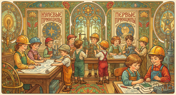 Основная идея тут – обучать детсадовцев, школьников, студентов по возможности нулевым принципам, ибо из небольшого их числа можно вырастить довольно разнообразные первые принципы. То есть на основе понимания нулевых принципов (“мышления из первых принципов”) можно отрастить себе разные варианты мышления по первым принципам – то есть получить физическое, математическое, компьютерное мышления, исходя из разных вариантов физики (ньютоновская, или квантовая с теорией относительности, или физика “квантовой гравитации”, которую только-только пытаются получить), математики (с разными “основаниями”, как прошлых веков, так и современных вроде унивалентных оснований), computer science (тут тоже есть разные варианты, надо учитывать не только классические вычисления компьютеров на логических ключах, но и вычисления квантовых компьютеров, компьютеров на ДНК, оптических компьютеров и т.д.). Сейчас же учат не соответствующим мышлениям, а “разделам” – теориям, которые вырастают из первых принципов, но не самим этим принципам. “Разделы” – это, например, в физике механика, оптика, электромагнитные явления. Они все вырастают из первых принципов, но сами эти принципы в них в явном виде не упоминаются.