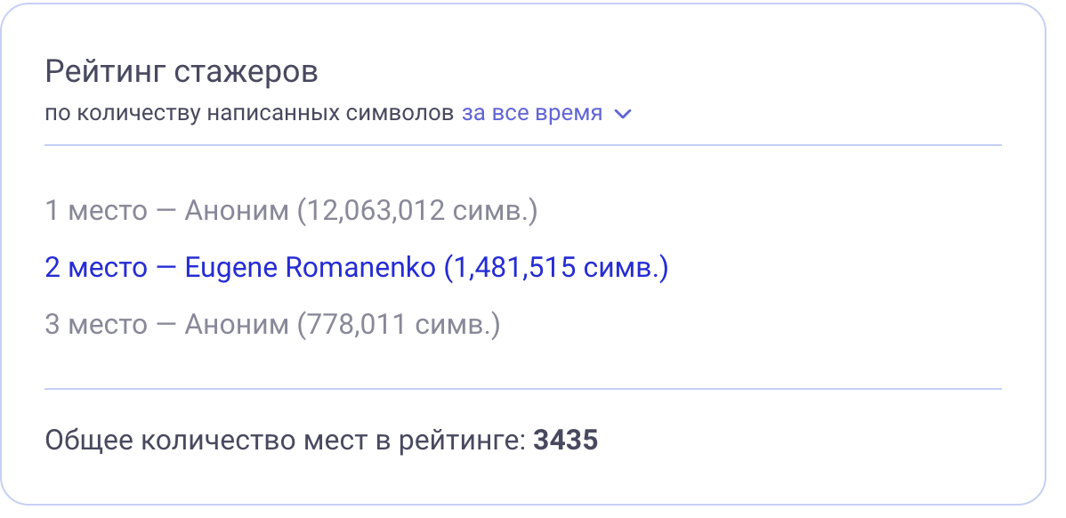 Резко выросло количество рабочих продуктов практики мышления письмом. Девиз “ни дня без заготовки, а то и двух-трёх”. Количество заготовок в клубе выросло на 80% за месяц, от чуть больше сотни до без малого двух. Часто мысль после пробуждения бурлит в голове так, что утро начинается с написания заготовки, а уже потом выполнения практики систематического медленного чтения. Забавно, выяснил, что в рейтинге стажёров Aisystant по количеству написанных символов за всё время вышел на второе место, накатав за 8 месяцев почти полтора миллиона знаков (хотя такая цель не преследовалась), но до первого места с 12 млн мне пока далеко: