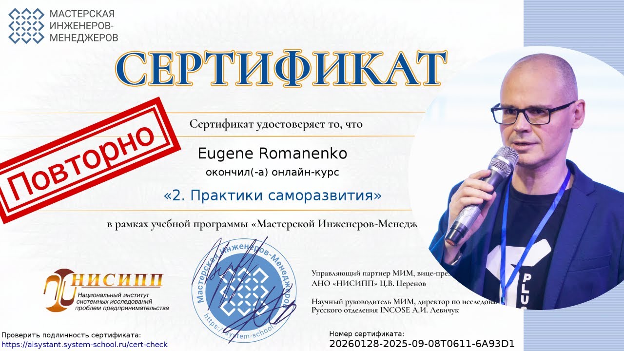 По завершению повторного освоения руководства вижу, что мастерство саморазвития у меня сформировалось в степени “Умение” (по каким-то практикам уже навык, хочу). Оно создано (чего не было восемь месяцев назад) и развивается, я вижу, как оно включается в ситуации, требующей применения мастерства, работает в режиме run-time и позволяет мне в роли ученика создавать рабочие продукты практик саморазвития, количество которых медленно, но верно переходит в качество, и которые я могу предъявить как себе, так и публично окружению.