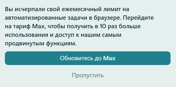 Ещё один интересный момент: в начале прошедшей недели со стороны разработчиков Comet-браузера были введены ограничения на количество запросов через “Задачи” (“в этом месяце Вы исчерпали лимит”), но к моему удивлению вчера и сегодня “лимиты” были сняты.