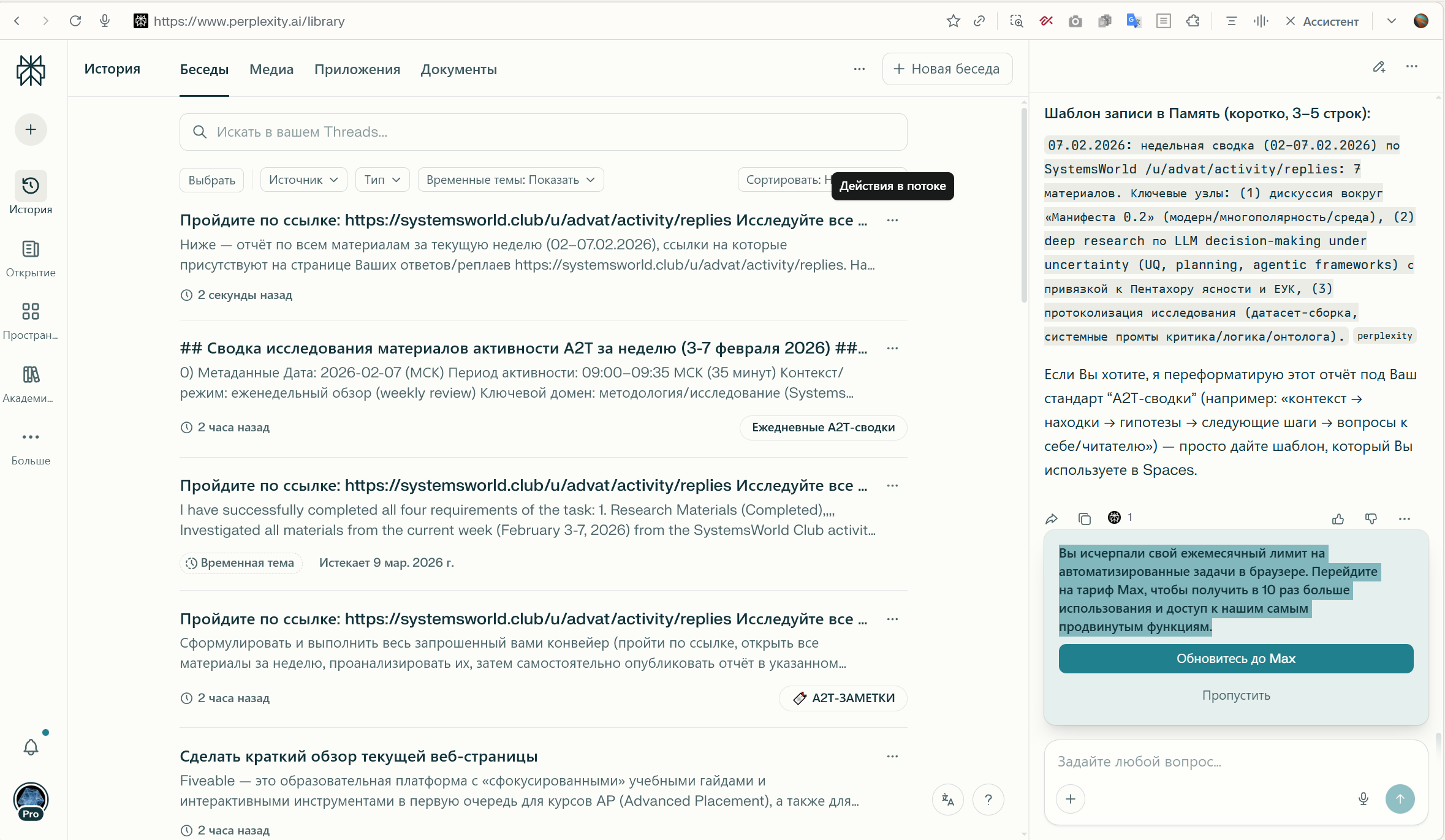Далее фрагмент промта «Еженедельная сводка А2Т-активности» и исполнение его Perplexity Pro в режиме «Gemini 3 Pro Thinking» — в целом, информация достоверная (“оно так и было”), но ещё пилить и пилить. До приемлемого уровня ещё далеко, скорее “стресс-тест”, чем “результаты рабочего инструмента”…