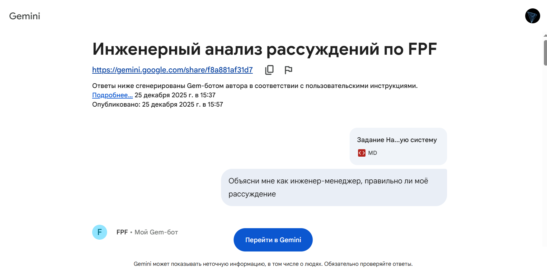 Чат с Gemini (см. выше: «Пообщался с Gemini ») не использовал: по представленной ссылке ( https://gemini.google.com/share/f8a881af31d7 ) продолжить чат не получилось — см. скрин: