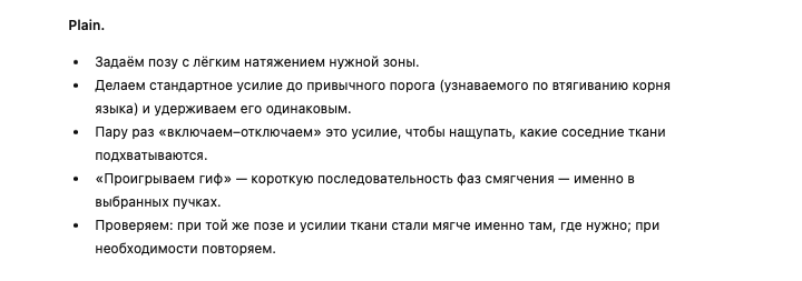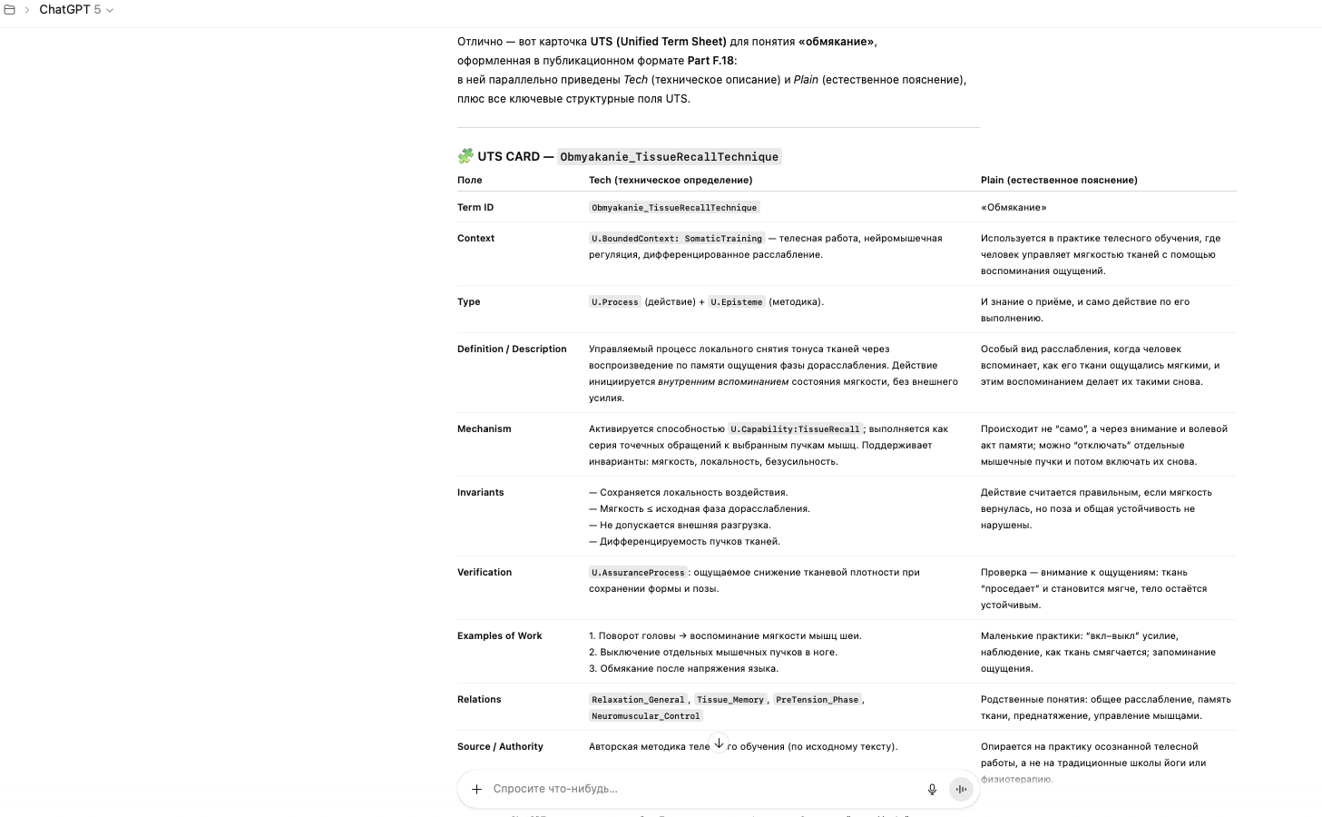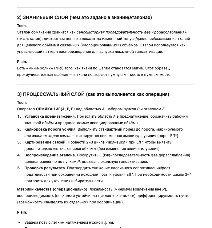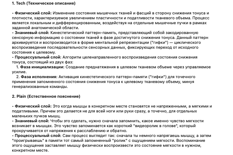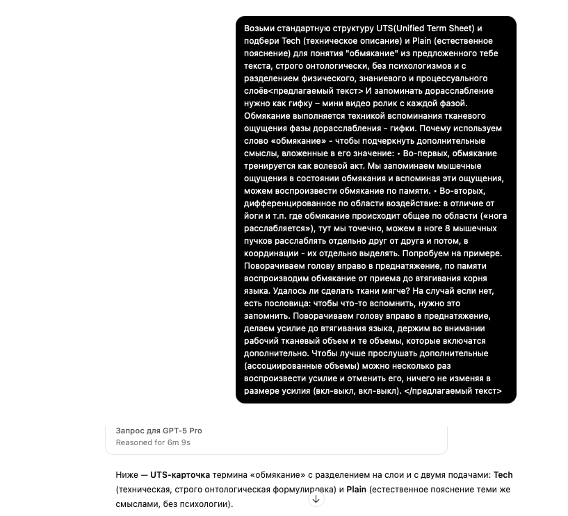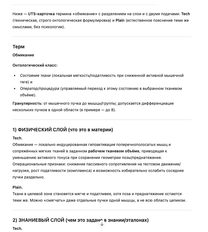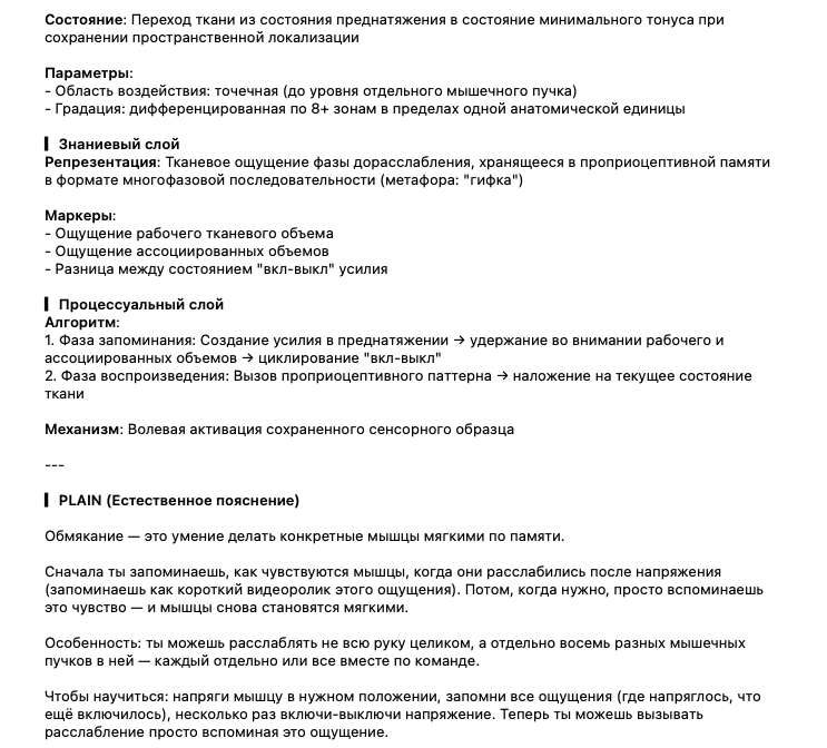 Возьми стандартную структуру UTS(Unified Term Sheet) и подбери Tech (техническое описание) и Plain (естественное пояснение) для понятия “обмякание” из предложенного тебе текста, строго онтологически, без психологизмов и с разделением физического, знаниевого и процессуального слоёв<предлагаемый текст> И запоминать дорасслабление нужно как гифку – мини видео ролик с каждой фазой. Обмякание выполняется техникой вспоминания тканевого ощущения фазы дорасслабления - гифки. Почему используем слово «обмякание» - чтобы подчеркнуть дополнительные смыслы, вложенные в его значение: • Во-первых, обмякание тренируется как волевой акт. Мы запоминаем мышечные ощущения в состоянии обмякания и вспоминая эти ощущения, можем воспроизвести обмякание по памяти. • Во-вторых, дифференцированное по области воздействие: в отличие от йоги и т.п. где обмякание происходит общее по области («нога расслабляется»), тут мы точечно, можем в ноге 8 мышечных пучков расслаблять отдельно друг от друга и потом, в координации - их отдельно выделять. Попробуем на примере. Поворачиваем голову вправо в преднатяжение, по памяти воспроизводим обмякание от приема до втягивания корня языка. Удалось ли сделать ткани мягче? На случай если нет, есть пословица: чтобы что-то вспомнить, нужно это запомнить. Поворачиваем голову вправо в преднатяжение, делаем усилие до втягивания языка, держим во внимании рабочий тканевый объем и те объемы, которые включатся дополнительно. Чтобы лучше прослушать дополнительные (ассоциированные объемы) можно несколько раз воспроизвести усилие и отменить его, ничего не изменяя в размере усилия (вкл-выкл, вкл-выкл). </предлагаемый текст>