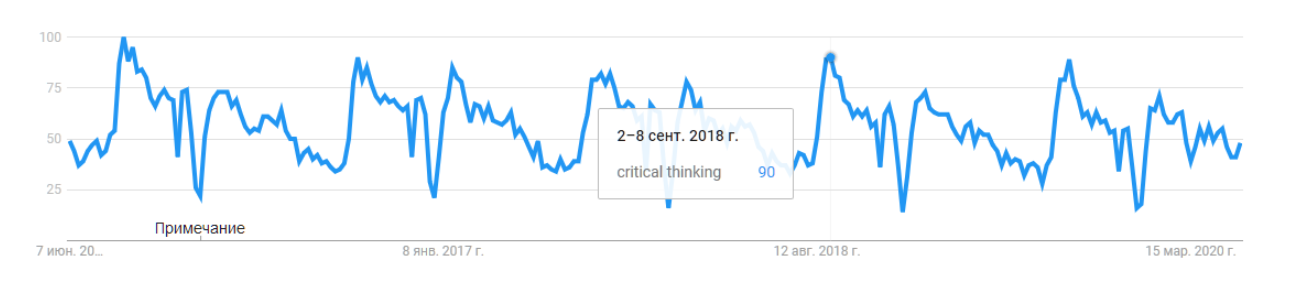 У термина была довольно бурная жизнь, его значение интерпретировалось то очень широко, то очень узко583. То, что это педагогическая традиция, а не что-то живое, используемое в жизни (просто логичное мышление), подтверждается графиком частоты запроса critical thinking в Гугле. Пик планетарного интереса ежегодно — 1 сентября, в каникулы интерес падает практически до нуля: