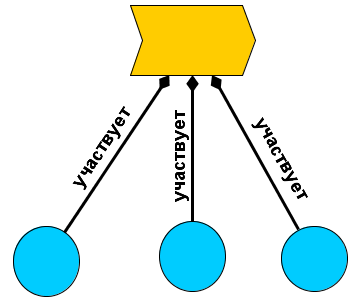 Во многих графических языках моделирования стрелочки с ромбиками на конце как раз означают отношение состава, причём целое там, где ромбик, а часть — где ромбика нет. Жёлтый «шеврон вбок» это стилизованная стрелка, означает, что что-то меняется во времени, им обозначен «процесс». А голубые кружочки означают физические предметы, участвующие в этом процессе. Голубые кружочки — это части процесса.