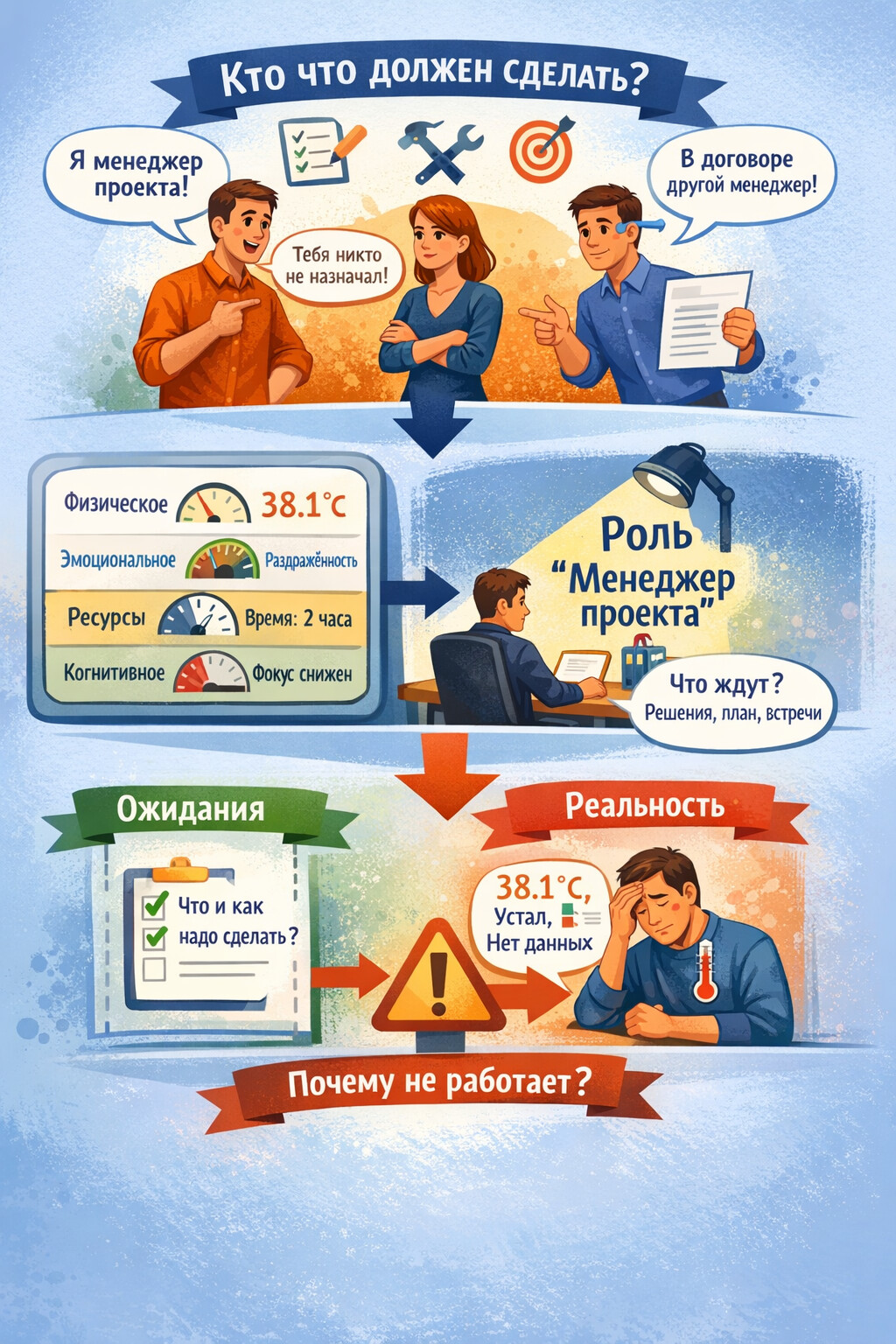Например, от менеджера ожидаются план и договорённости, но человек болеет (температура 38.1) и фактически не выполняет способ работы. Здесь проблема не в том, что “роль не та”, а в разрыве между ожиданием и реальным состоянием человека.