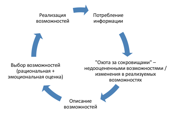 Помните о том, что работа с возможностями – это цикл, и бесконечное развитие заключается в том, что вы постоянно потребляете информацию, ищете возможности, реализуете их и оцениваете качество, и на каждом такте улучшаете свои практики. В итоге вы можете реализовывать все более и более сложные системы.