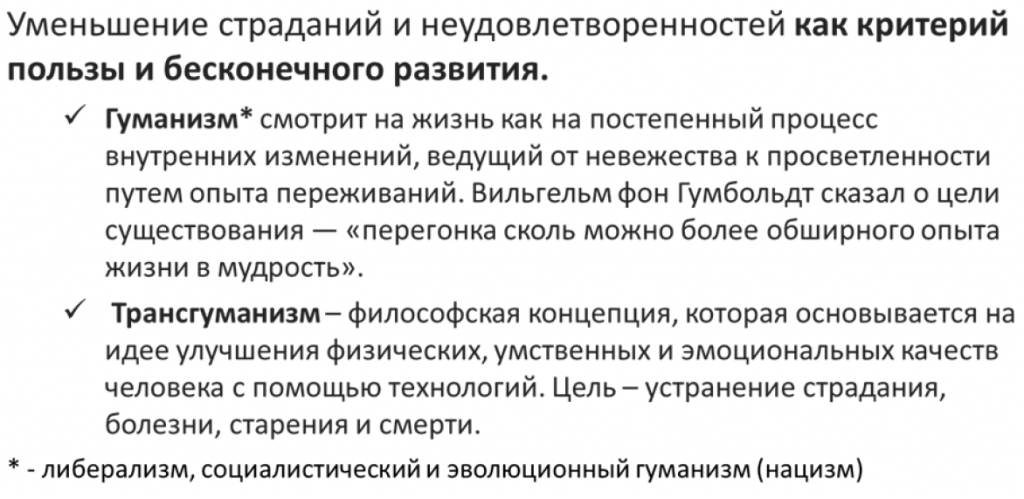 Практически все религии говорят о сострадании. Причем не только религии, но и светские теории (идеологии) такие как гуманизм хотят сделать жизнь людей намного лучше. Все идеологии направлены на то, чтобы люди меньше страдали и были счастливы. Либерализм, социализм, или эволюционный гуманизм (или нацизм) – руководствуются идеями гуманизма[1]. Просто каждая из религий и каждая идеология подразумевают свои средства и свои представления о том, каким людям нужно облегчить страдания и за счет кого сделать жизнь лучше. Мы не будем обсуждать отличия разных теорий сострадания, а только констатируем, что сострадание является распространенной концепцией, и ее можно взять в качестве смысла бесконечного развития.