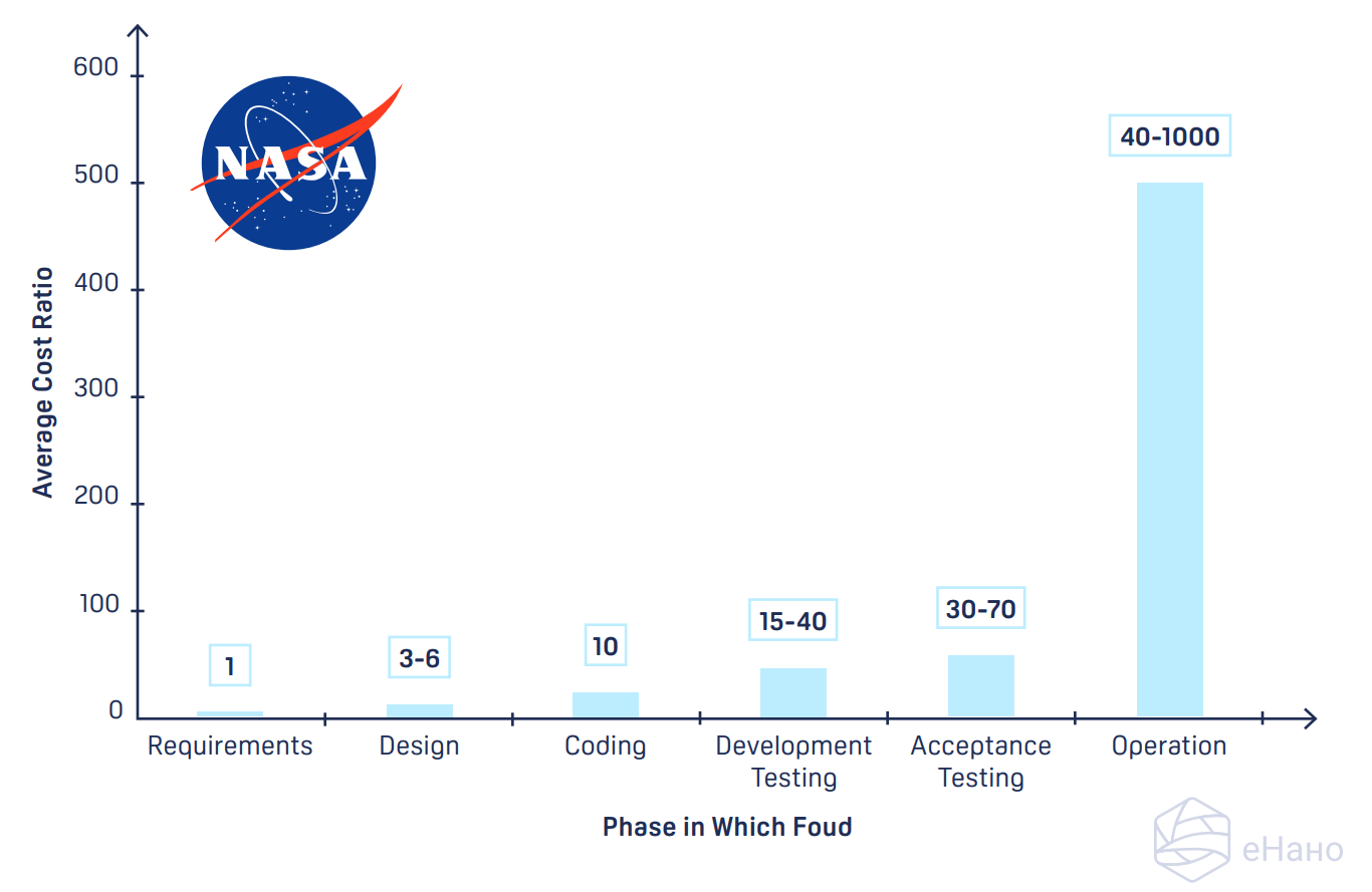 И мне тут есть что сказать, потому что как пример в курсе часто приводится стоимость исправления ошибок космических систем, а я ровно такие системы и разрабатываю. В текущей версии курса не смог быстро найти, но речь об вот этом графике: