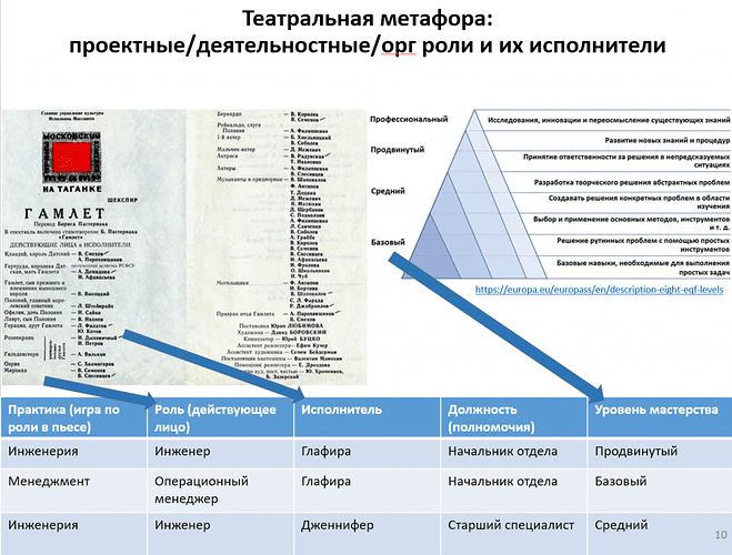Чтобы стать действующими лицами в проектах, людям как исполнителям ролей нужно занять в них какие-то деятельностные/профессиональные роли (менеджера, архитектора, видеографа, повара). Театральная метафора — это когда мы играем проект как пьесу с ролями, и явно или неявно договариваемся кто играет какую роль, то есть кто что делает в этой пьесе.Мы отличаем исполнителей ролей, сами роли по исполнению каких-то практик/деятельностей в проекте, должности как выражение ответственности/полномочий по распоряжению ресурсами труда и капитала, квалификацию/уровень мастерства в исполнении ролей.