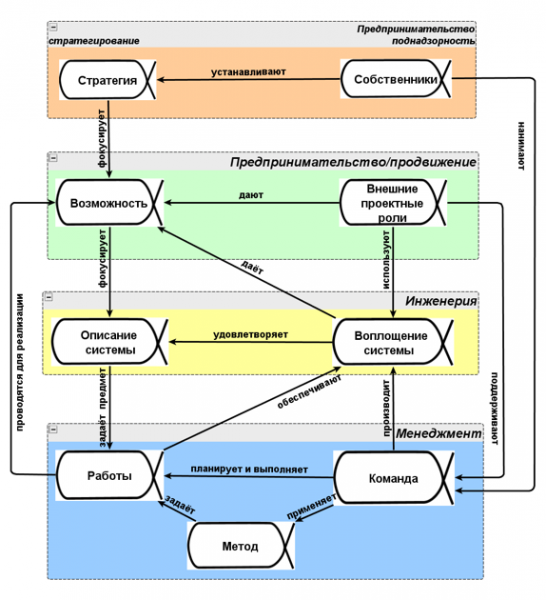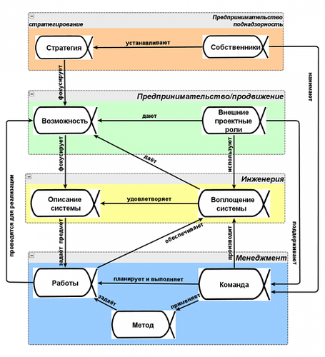 На диаграмме изображены два времени: время эксплуатации/run-time целевой системы с подсистемами в составе надсистемы (её окружения). Но главное -- это не менее сложно организованное обеспечение жизненного цикла целевой системы, так называемые цепочки обеспечения, работающие во время разработки, design-time. Сначала программист работает, обращая внимание только на свою программу, но по мере роста сложности проекта он обращает внимание и на людей, которые заняты системой. И эти люди тоже могут быть представлены как системы. Только в run-time мы рассматриваем отношения "часть-целое" между системами, а в design-time основное отношение "система X делает что-то с системой Y". Менеджмент -- это когда основное внимание уходит на происходящее в design-time.