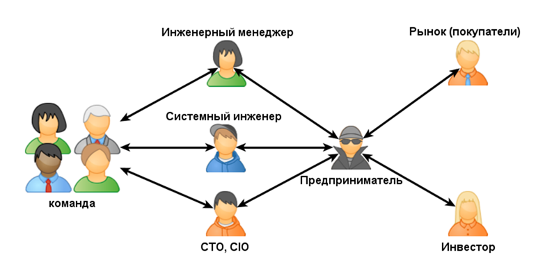 На примере вот этой диаграммы смотрим, чем в организуемом предпринимателем проекте занимаются эти разные роли (сначала все роли играет один человек, потом каждую роль может играть один человек, потом каждую роль может играть по нескольку человек. CTO и CIO занимаются производством/заводом, а системный инженер -- продуктом):