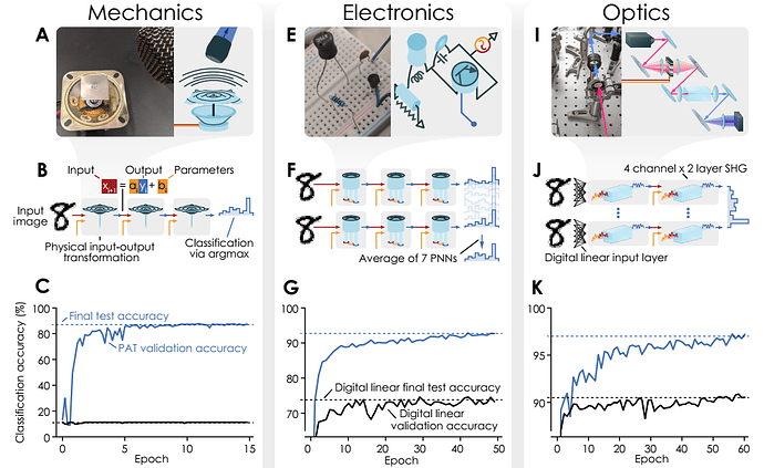 На закуску работа мая 2021 года, лишний раз показывающая независимость алгоритмики от физического субстрата (и этому понятию вычисления/мышления, не зависящего от субстрата, замечу, нужно учить всех, чтобы происходящие "чудеса" не казались чудесами! Это неважно, что речь идёт о самом дне технологического стека, эта независимость вычислений от субстрата должна хорошо пониматься на любом системном уровне): "Deep physical neural networks enabled by a backpropagation algorithm for arbitrary physical systems", https://arxiv.org/abs/2104.13386. Предлагается делать нейронную сетку из буквально любой физической системы с какими-то нелинейностями, настраивая параметры этой системы через backpropagation ровно как в обычных нейронных сетях, вычисляемых на CPU или GPU традиционной компьютерной инфраструктуры. Для развлечения и демонстрации взяли механическую систему из динамика и микрофона, электронную из транзистора и катушки, оптическую из генератора второй гармоники -- и построили из них нейронные сетки. И получили удивительно приличные результаты. Для чего это делали? Хотят на несколько порядков по сравнению с GPU увеличить энергоэффективность работы с нейронными сетями и одновременно на несколько порядков увеличить скорость.
